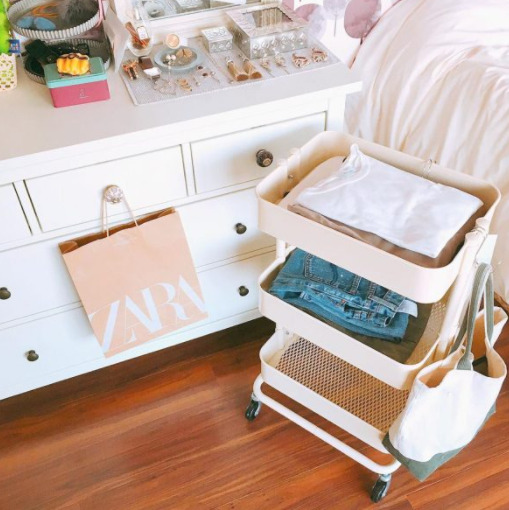 #IKEAロースコグ活用術 「朝のメイクタイムが変わった!コスメワゴンにしたら、毎日のルーティンが10分短縮♡ 移動できるから窓際の自然光で仕上げもバッチリ」